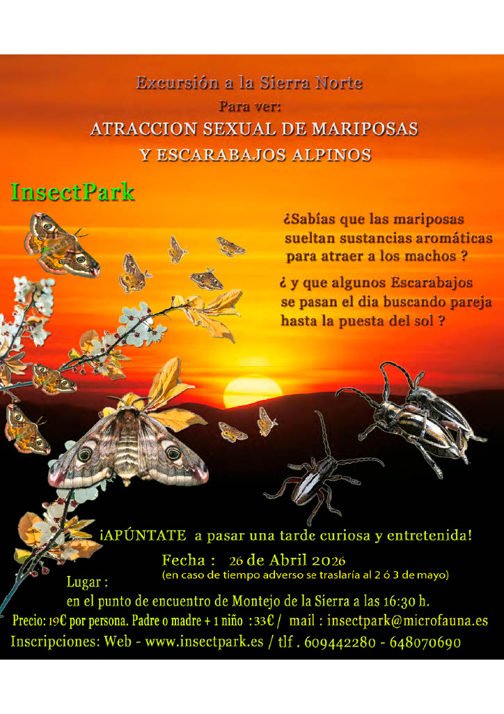 A medida que avanza la tarde y la naturaleza se activa, nos adentraremos en el entorno de la Sierra de Madrid para observar de cerca los rituales de atracción de estas especies. Una experiencia única para aprender, disfrutar y sorprenderte con los secretos mejor guardados del mundo de los insectos.